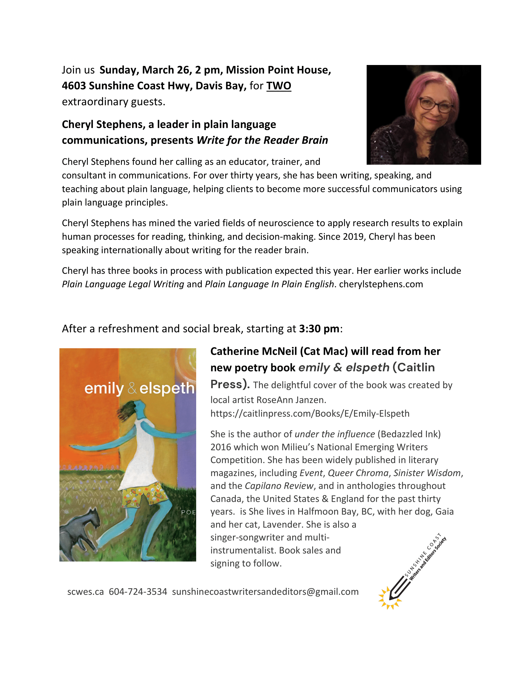 emily & elspeth is a finalist in three categories of the Sunshine Coast Writers & Editors Society book contest: Poetry, Diverse Voices and Sunshine Coast Voices. The full list of finalists will be available soon on our website scwes.ca. If you would like to attend the award ceremonies where the winners will be announced, it will be on Saturday Aug. 12th 1 pm at the Gibsons Public Market.